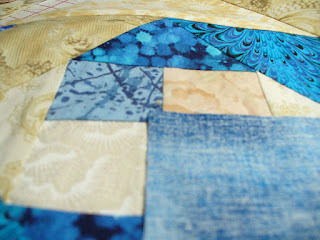 Ok, I got a good start and some tips for the beginners. Remember, this particular block is made up of all bias tri's, except for the middle four patch. Care must be taken, centers have to be marked and when sewing the patches, put your entire hand on the block and push through the machine gently, so as not to stretch anything.